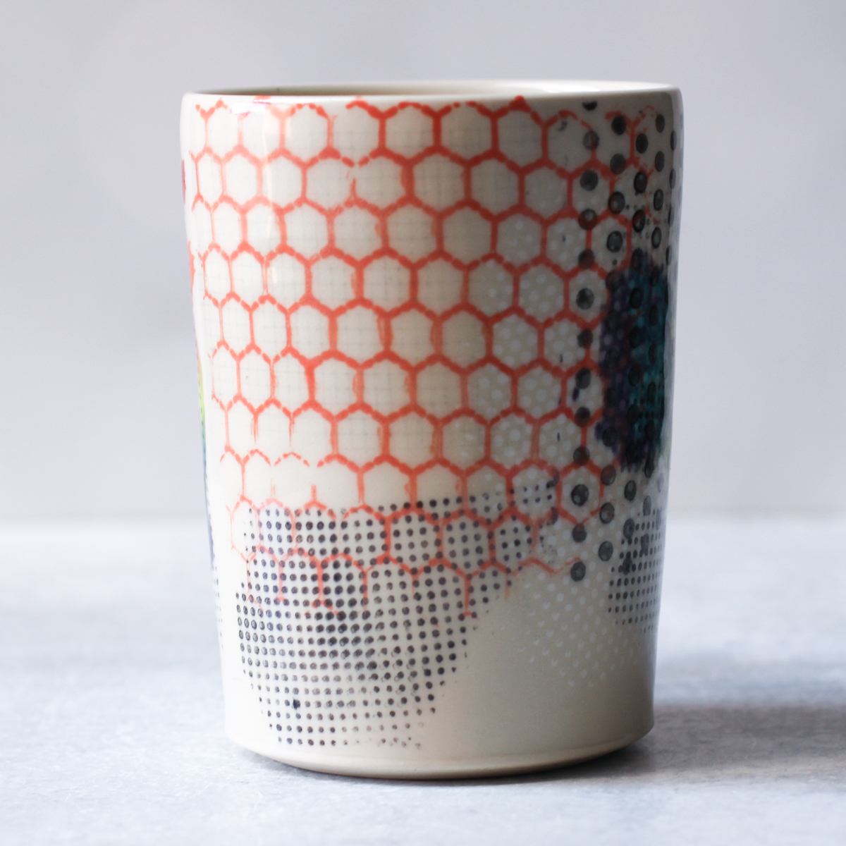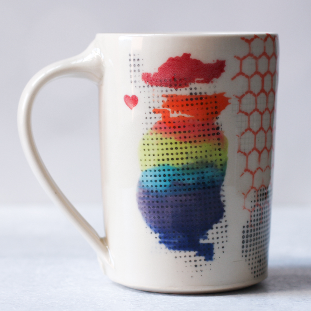 All pieces are made by hand in my Easthampton, Massachusetts studio. Each piece begins as white stoneware clay. First, the clay is thrown by hand on the potter’s wheel, forming the shape. For mugs and other items with handles, a coil of clay is joined to the side, and methodically pulled to form a smooth, comfortable handle. Following a bisque firing in the kiln, the piece is hand-decorated using a combination of hand-drawn underglaze transfer and slip-painting. Then the piece is hand-dipped in a clear glaze and fired once more in the kiln to make the finished product.