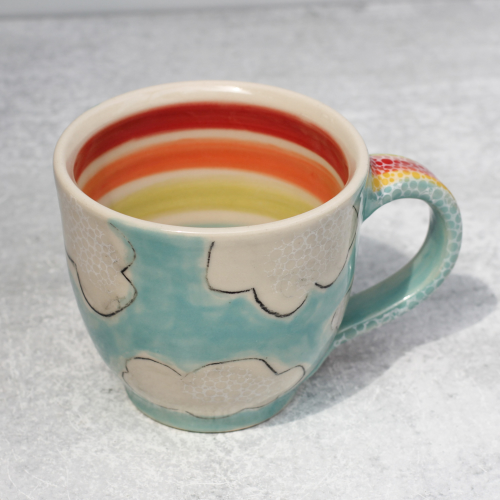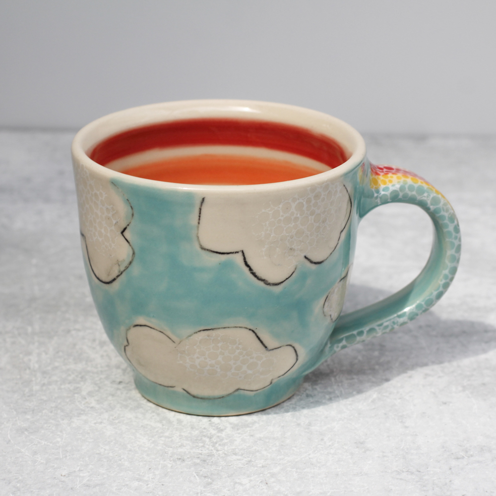 All pieces are made by hand in my Easthampton, Massachusetts studio. Each piece begins as white stoneware clay. First, the clay is thrown by hand on the potter’s wheel, forming the shape. For mugs and other items with handles, a coil of clay is joined to the side, and methodically pulled to form a smooth, comfortable handle. Following a bisque firing in the kiln, the piece is hand-decorated using a combination of hand-drawn underglaze transfer and slip-painting. Then the piece is hand-dipped in a clear glaze and fired once more in the kiln to make the finished product.