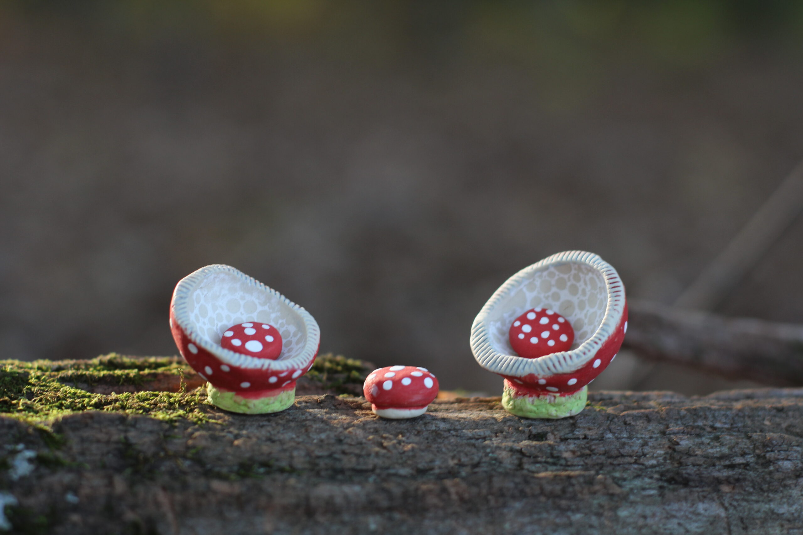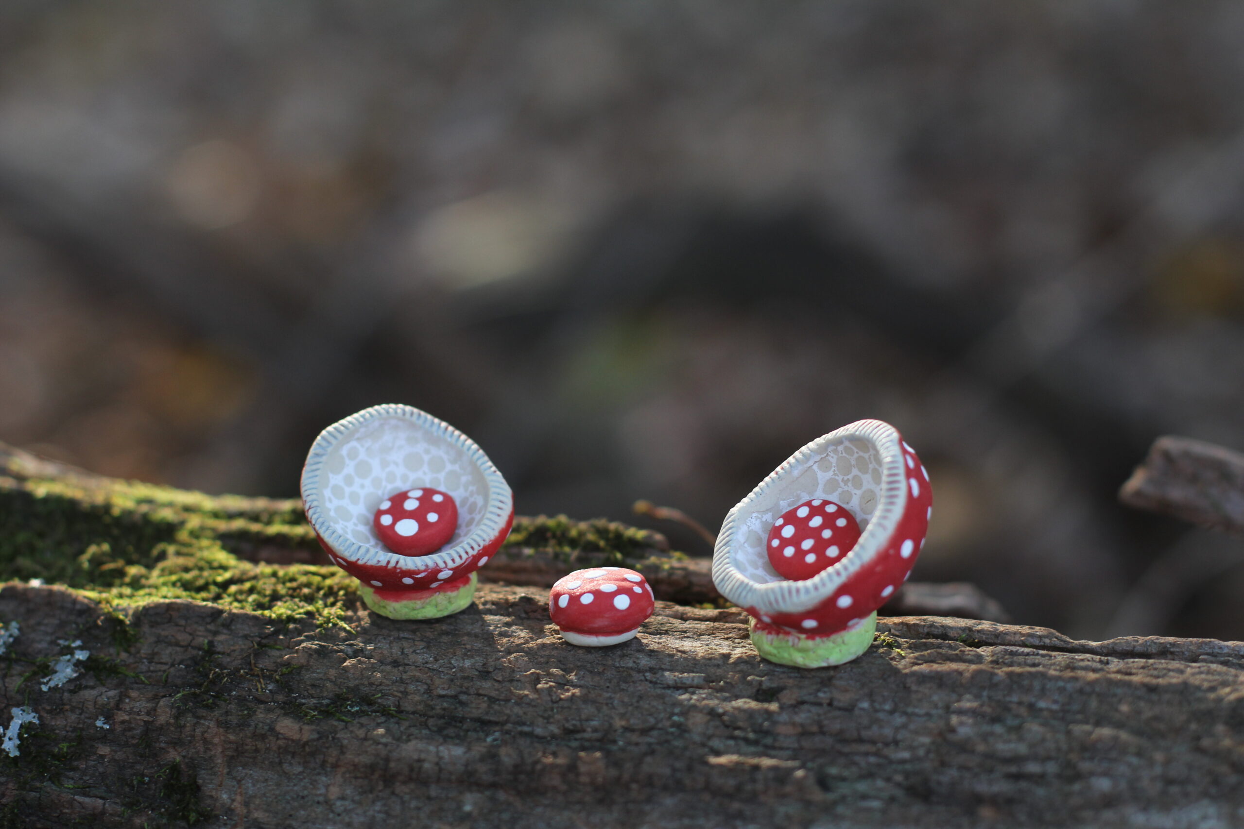 Handmade ceramic fairy house furniture set. Two mushroom cap pod chairs with a teeny mushroom tea table.