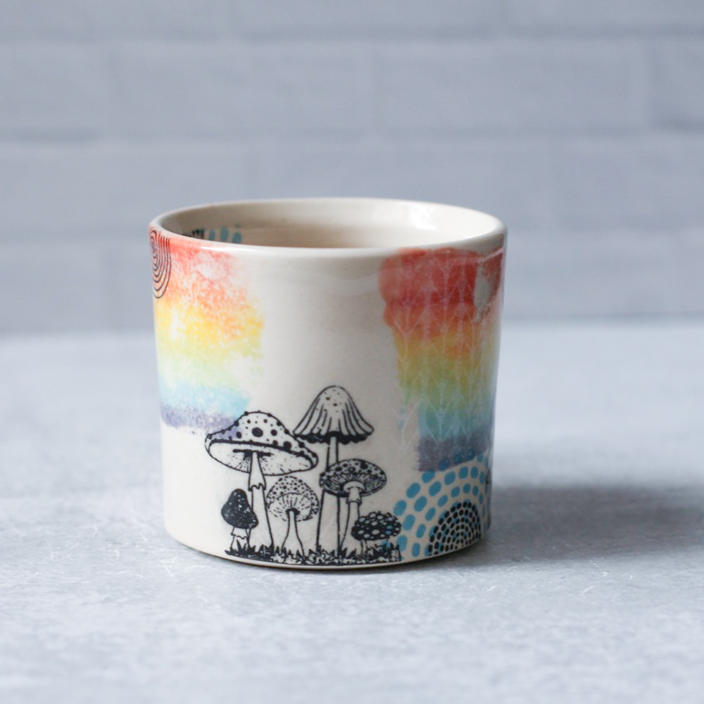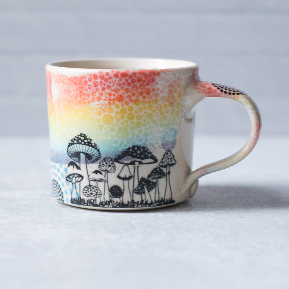 All pieces are made by hand in my Easthampton, Massachusetts studio. Each piece begins as white stoneware clay. First, the clay is thrown by hand on the potter’s wheel, forming the shape. For mugs and other items with handles, a coil of clay is joined to the side, and methodically pulled to form a smooth, comfortable handle. Following a bisque firing in the kiln, the piece is hand-decorated using a combination of hand-drawn underglaze transfer and slip-painting. Then the piece is hand-dipped in a clear glaze and fired once more in the kiln to make the finished product.