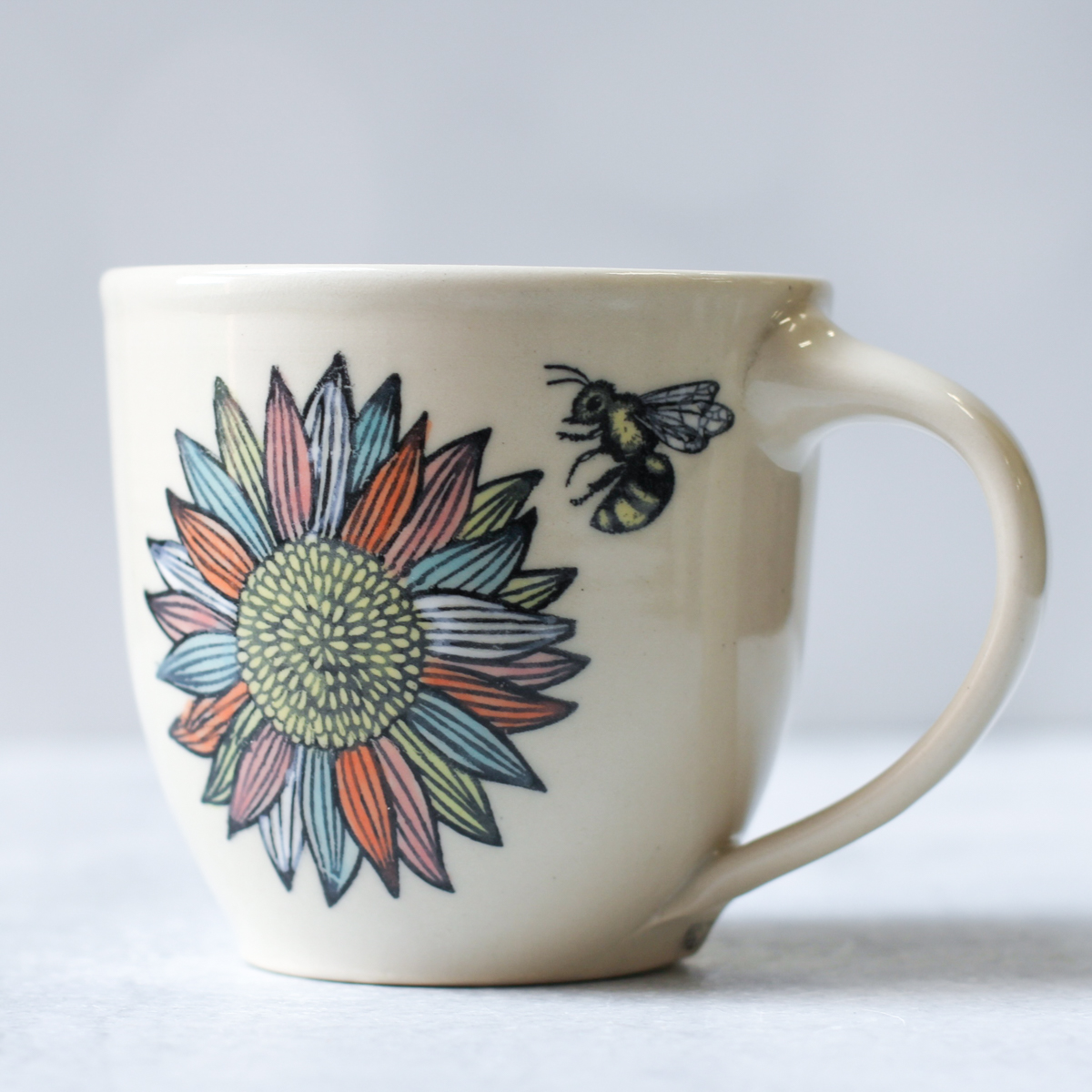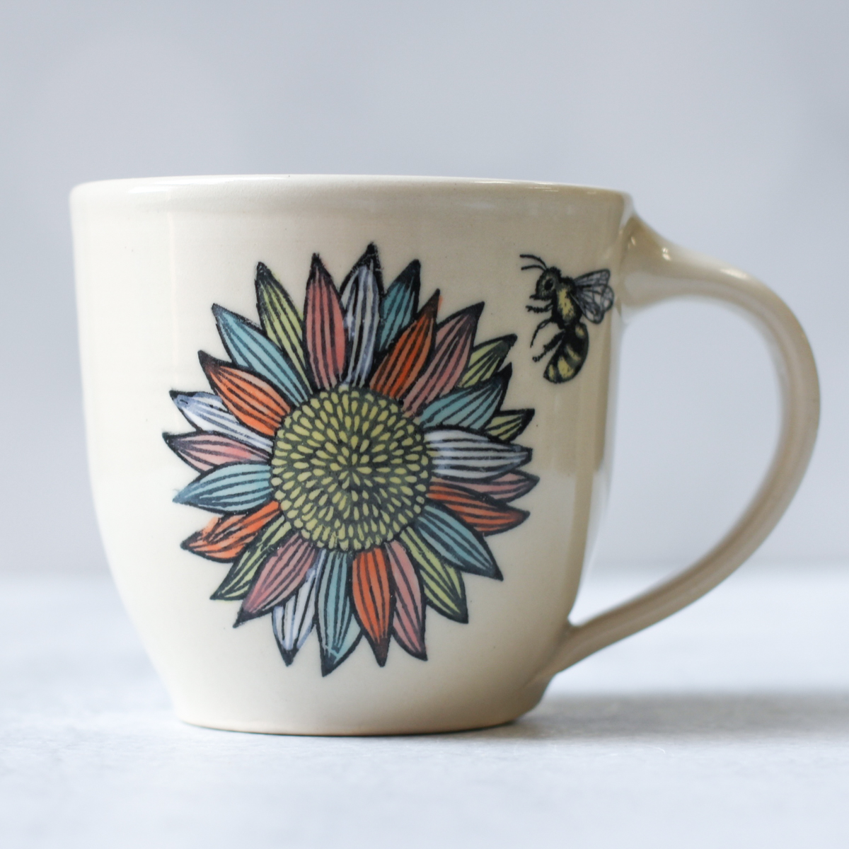 Mug – Cozy Mug – Colorful Sunflowers and Bees – Approx 16 oz mug