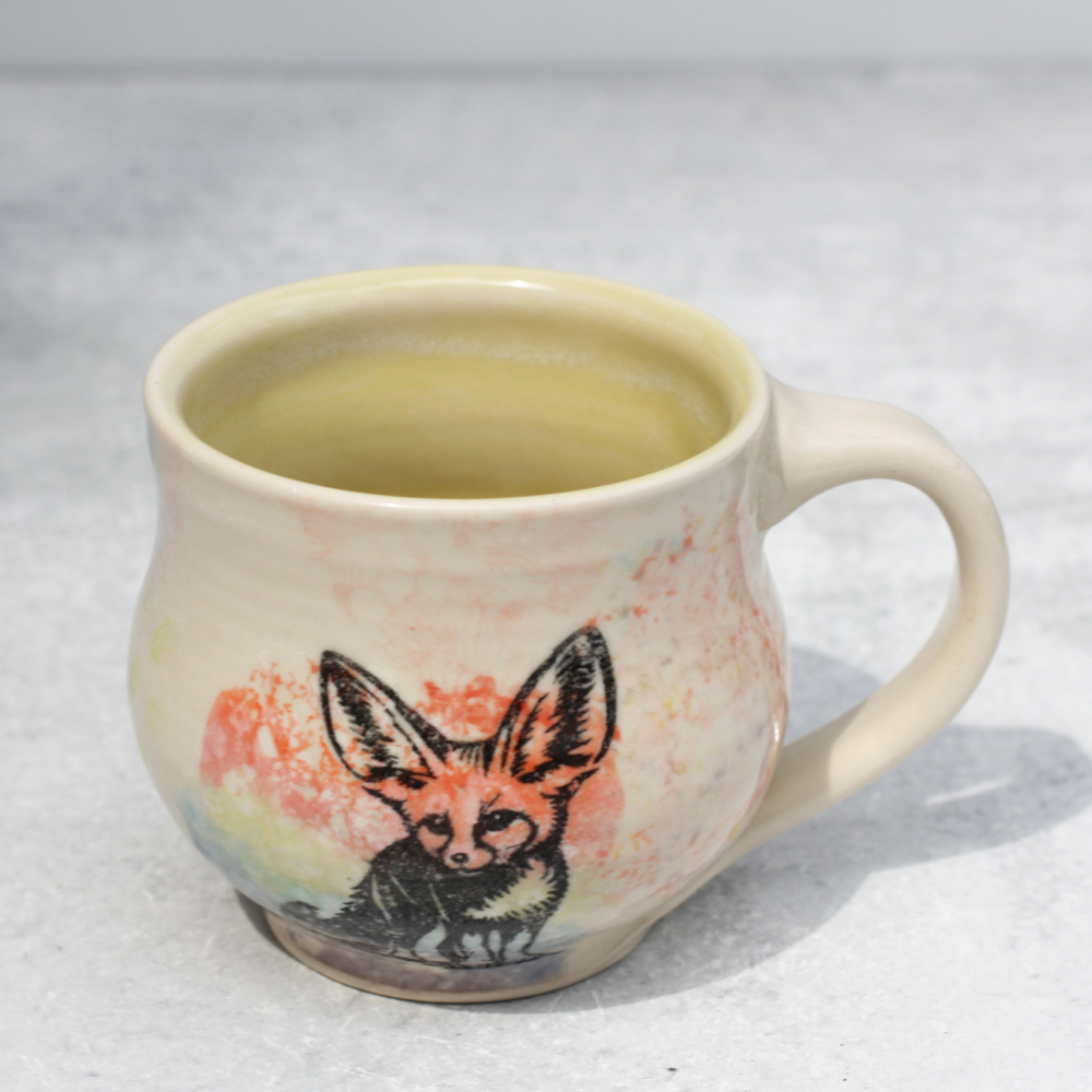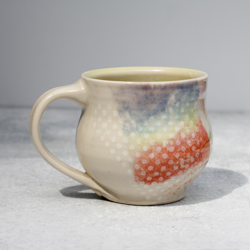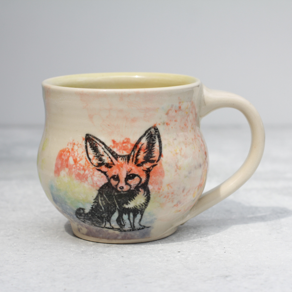 All pieces are made by hand in my Easthampton, Massachusetts studio. Each piece begins as white stoneware clay. First, the clay is thrown by hand on the potter’s wheel, forming the shape. For mugs and other items with handles, a coil of clay is joined to the side, and methodically pulled to form a smooth, comfortable handle. Following a bisque firing in the kiln, the piece is hand-decorated using a combination of hand-drawn underglaze transfer and slip-painting. Then the piece is hand-dipped in a clear glaze and fired once more in the kiln to make the finished product.