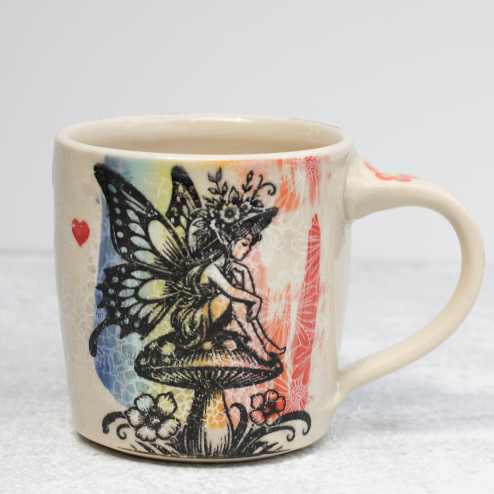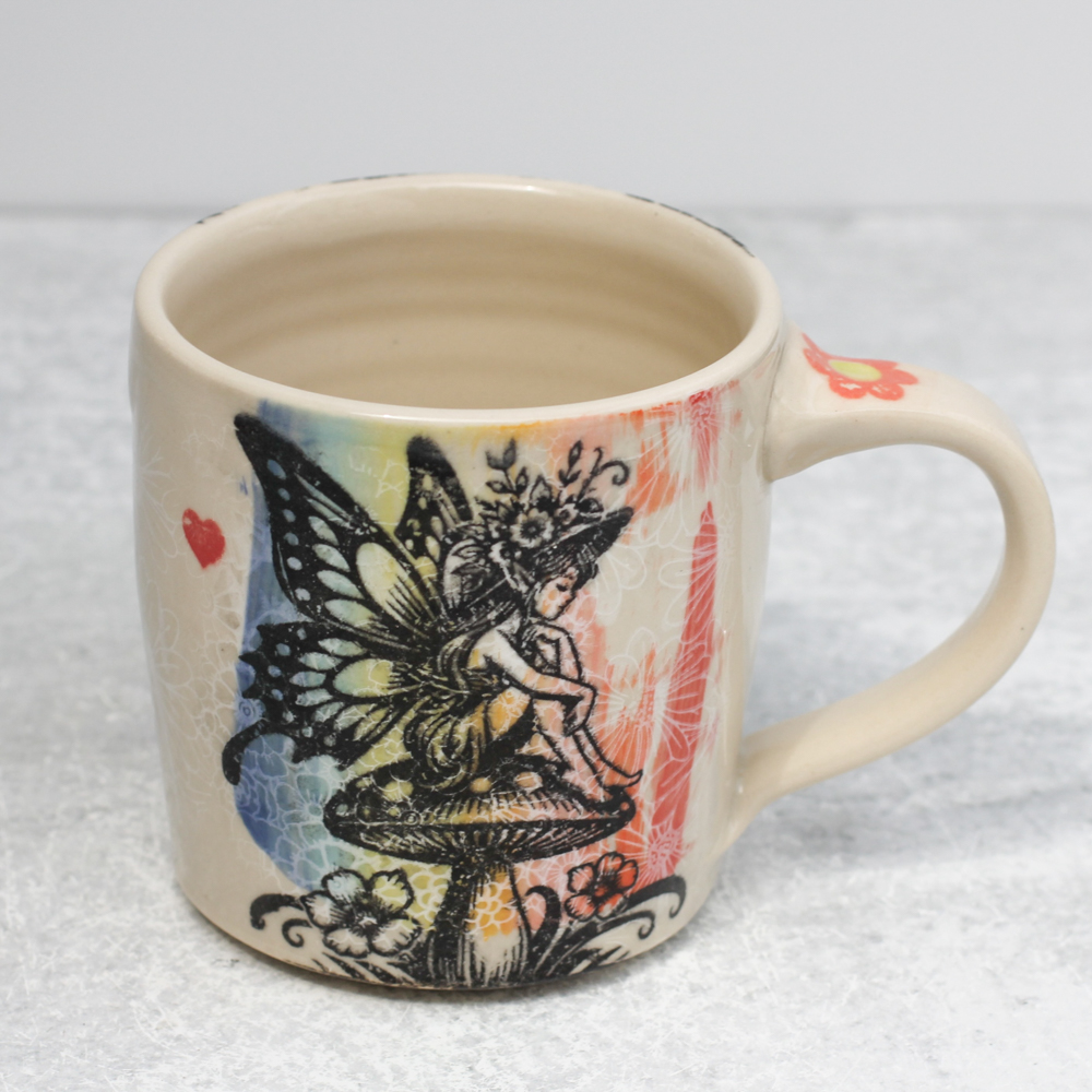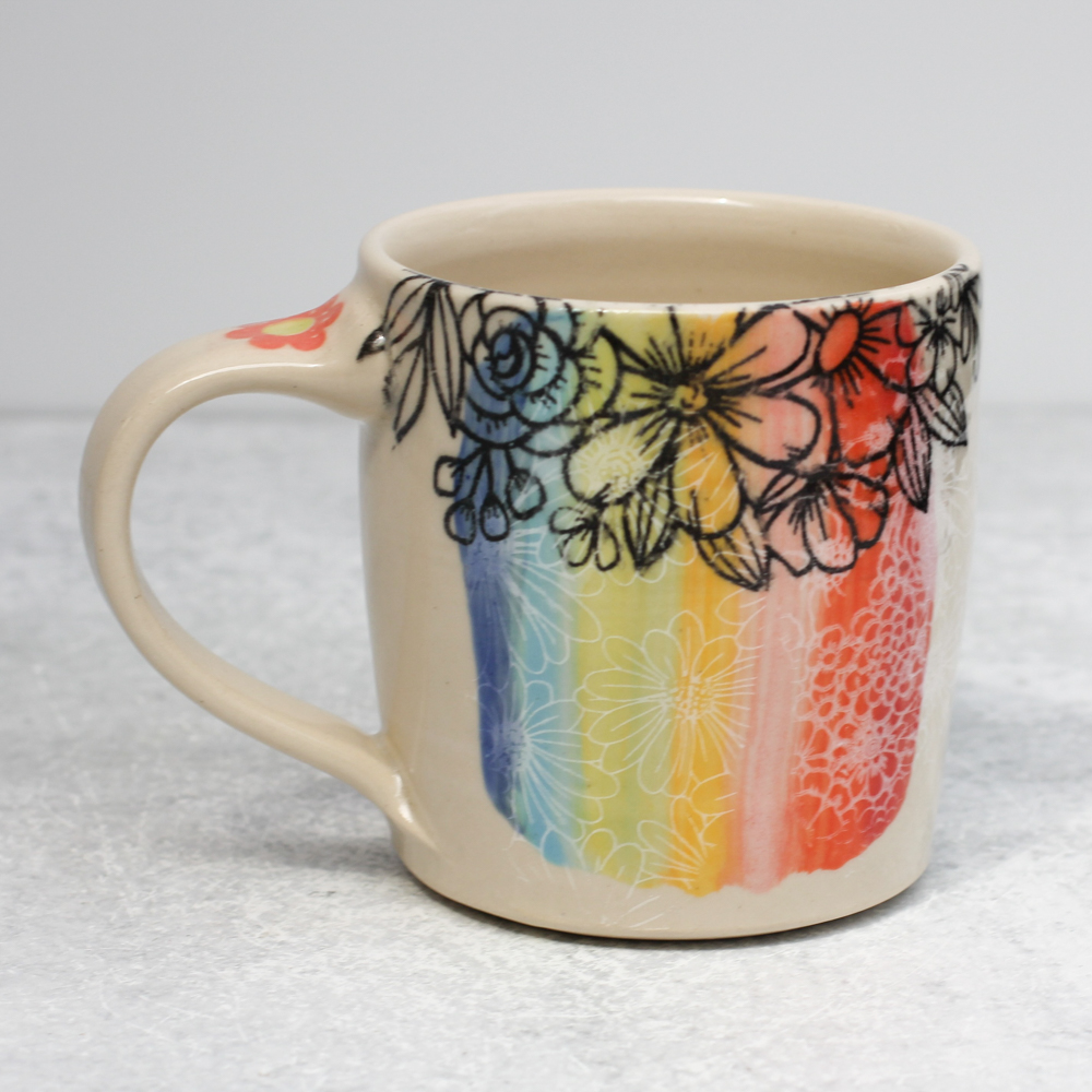 All pieces are made by hand in my Easthampton, Massachusetts studio. Each piece begins as white stoneware clay. First, the clay is thrown by hand on the potter’s wheel, forming the shape. For mugs and other items with handles, a coil of clay is joined to the side, and methodically pulled to form a smooth, comfortable handle. Following a bisque firing in the kiln, the piece is hand-decorated using a combination of hand-drawn underglaze transfer and slip-painting. Then the piece is hand-dipped in a clear glaze and fired once more in the kiln to make the finished product.