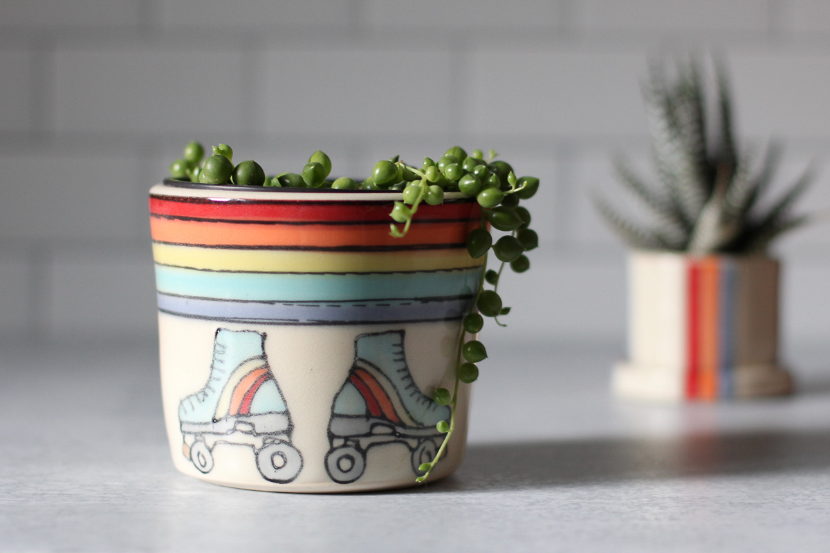 This handmade ceramic planter is intended for ease of use to help beautify your desk, shelves, and windowsills. This planter was hand thrown on a potter’s wheel in my Easthampton, Massachusetts studio. The combination of the warm white stoneware with the vibrant surface design brings a simple, modern look that stands out in any home. And if you’re not much of a greenthumb, this pot can also be used as a catch-all organizer on a countertop or desk.