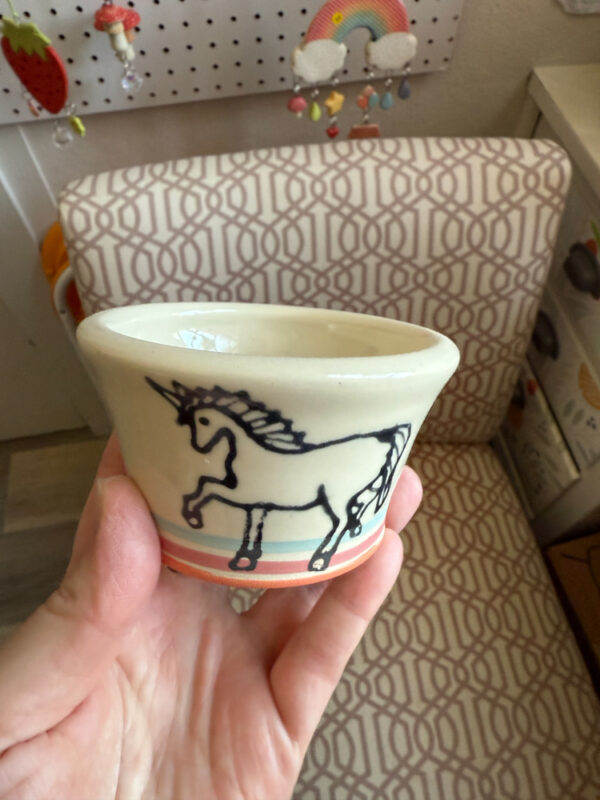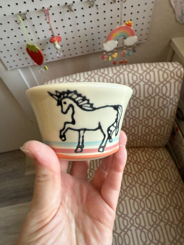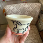 All pieces are made by hand in my Easthampton, Massachusetts studio. Each piece begins as white stoneware clay. First, the clay is thrown by hand on the potter’s wheel, forming the shape. For mugs and other items with handles, a coil of clay is joined to the side, and methodically pulled to form a smooth, comfortable handle. Following a bisque firing in the kiln, the piece is hand-decorated using a combination of hand-drawn underglaze transfer and slip-painting. Then the piece is hand-dipped in a clear glaze and fired once more in the kiln to make the finished product.
