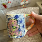 All pieces are made by hand in my Easthampton, Massachusetts studio. Each piece begins as white stoneware clay. First, the clay is thrown by hand on the potter’s wheel, forming the shape. For mugs and other items with handles, a coil of clay is joined to the side, and methodically pulled to form a smooth, comfortable handle. Following a bisque firing in the kiln, the piece is hand-decorated using a combination of hand-drawn underglaze transfer and slip-painting. Then the piece is hand-dipped in a clear glaze and fired once more in the kiln to make the finished product.