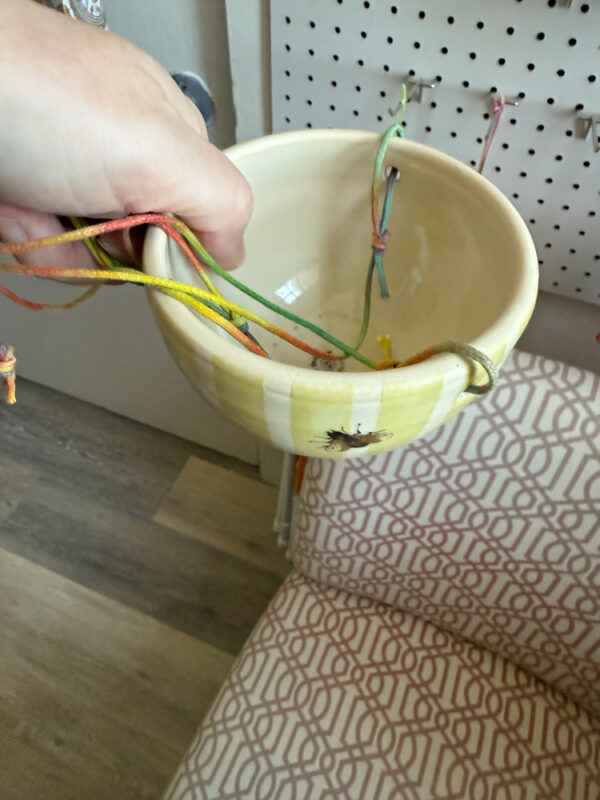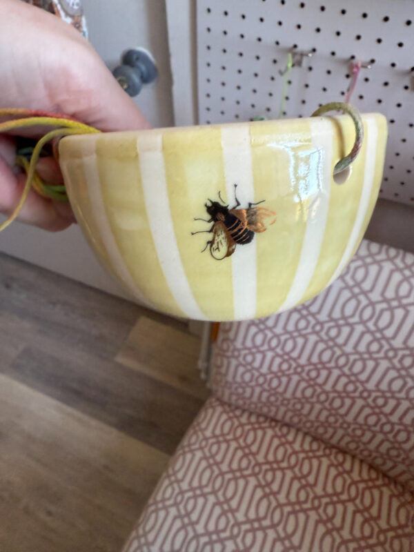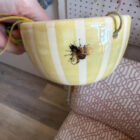 All pieces are made by hand in my Easthampton, Massachusetts studio. Each piece begins as white stoneware clay. First, the clay is thrown by hand on the potter’s wheel, forming the shape. For mugs and other items with handles, a coil of clay is joined to the side, and methodically pulled to form a smooth, comfortable handle. Following a bisque firing in the kiln, the piece is hand-decorated using a combination of hand-drawn underglaze transfer and slip-painting. Then the piece is hand-dipped in a clear glaze and fired once more in the kiln to make the finished product.