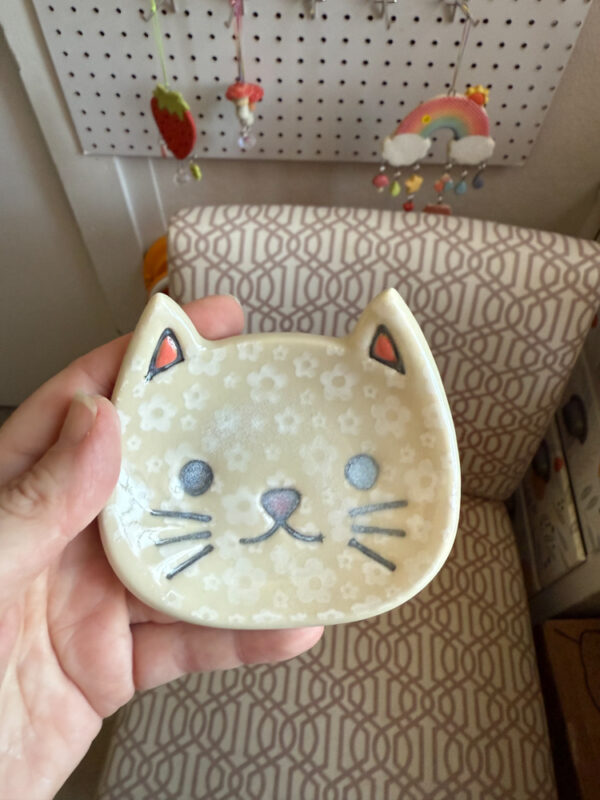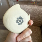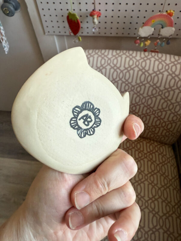 All pieces are made by hand in my Easthampton, Massachusetts studio. Each piece begins as white stoneware clay. First, the clay is thrown by hand on the potter’s wheel, forming the shape. For mugs and other items with handles, a coil of clay is joined to the side, and methodically pulled to form a smooth, comfortable handle. Following a bisque firing in the kiln, the piece is hand-decorated using a combination of hand-drawn underglaze transfer and slip-painting. Then the piece is hand-dipped in a clear glaze and fired once more in the kiln to make the finished product.