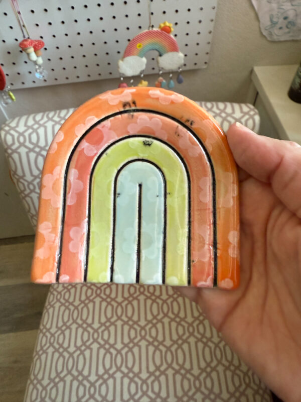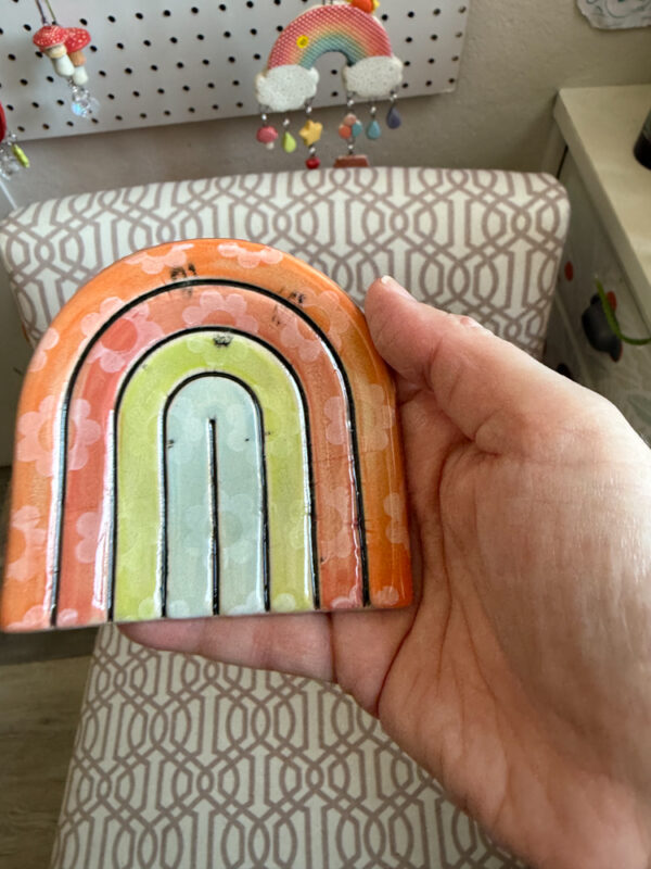 All pieces are made by hand in my Easthampton, Massachusetts studio. Each piece begins as white stoneware clay. First, the clay is thrown by hand on the potter’s wheel, forming the shape. For mugs and other items with handles, a coil of clay is joined to the side, and methodically pulled to form a smooth, comfortable handle. Following a bisque firing in the kiln, the piece is hand-decorated using a combination of hand-drawn underglaze transfer and slip-painting. Then the piece is hand-dipped in a clear glaze and fired once more in the kiln to make the finished product.
