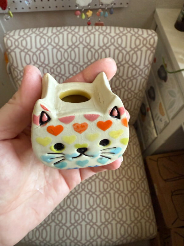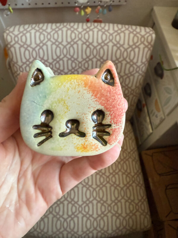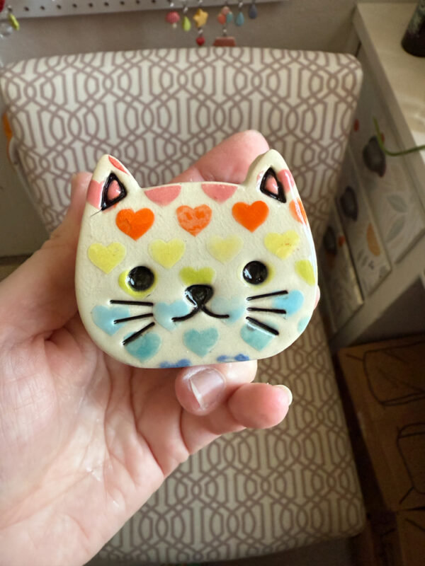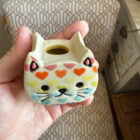 All pieces are made by hand in my Easthampton, Massachusetts studio. Each piece begins as white stoneware clay. First, the clay is thrown by hand on the potter’s wheel, forming the shape. For mugs and other items with handles, a coil of clay is joined to the side, and methodically pulled to form a smooth, comfortable handle. Following a bisque firing in the kiln, the piece is hand-decorated using a combination of hand-drawn underglaze transfer and slip-painting. Then the piece is hand-dipped in a clear glaze and fired once more in the kiln to make the finished product.