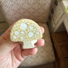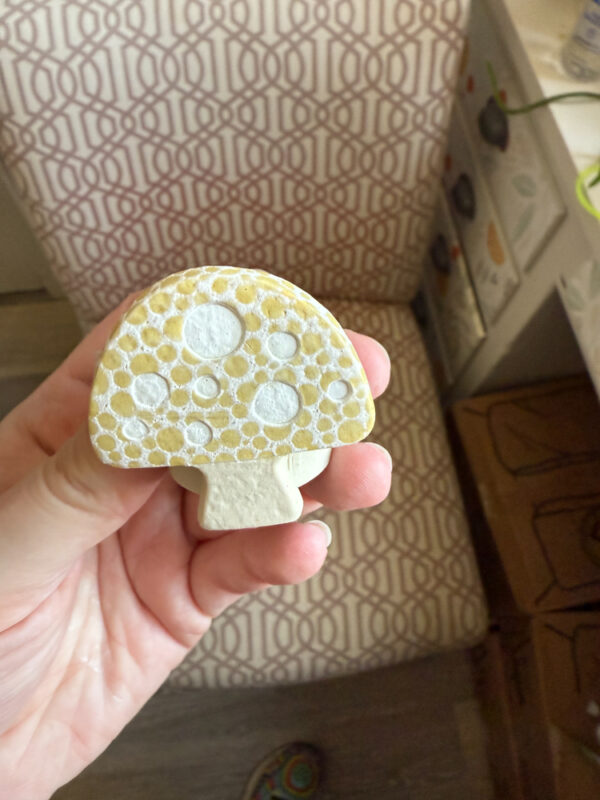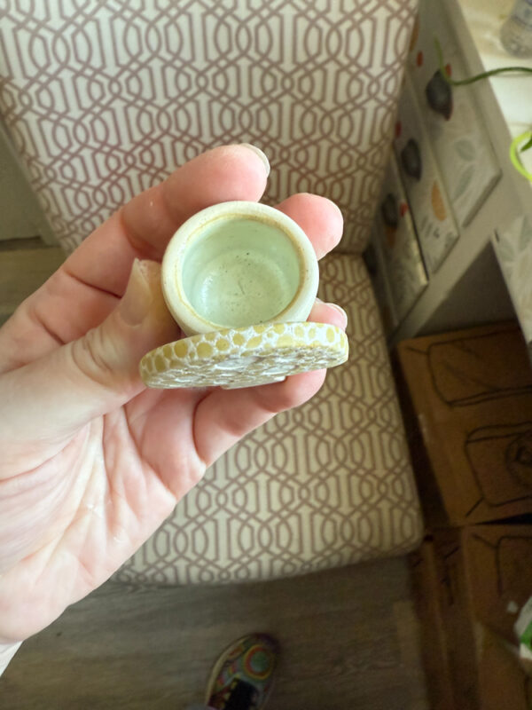 All pieces are made by hand in my Easthampton, Massachusetts studio. Each piece begins as white stoneware clay. First, the clay is thrown by hand on the potter’s wheel, forming the shape. For mugs and other items with handles, a coil of clay is joined to the side, and methodically pulled to form a smooth, comfortable handle. Following a bisque firing in the kiln, the piece is hand-decorated using a combination of hand-drawn underglaze transfer and slip-painting. Then the piece is hand-dipped in a clear glaze and fired once more in the kiln to make the finished product.