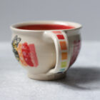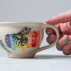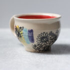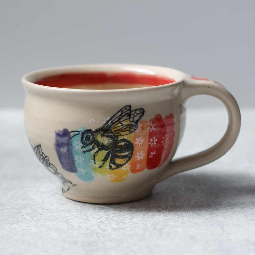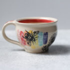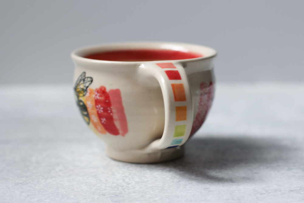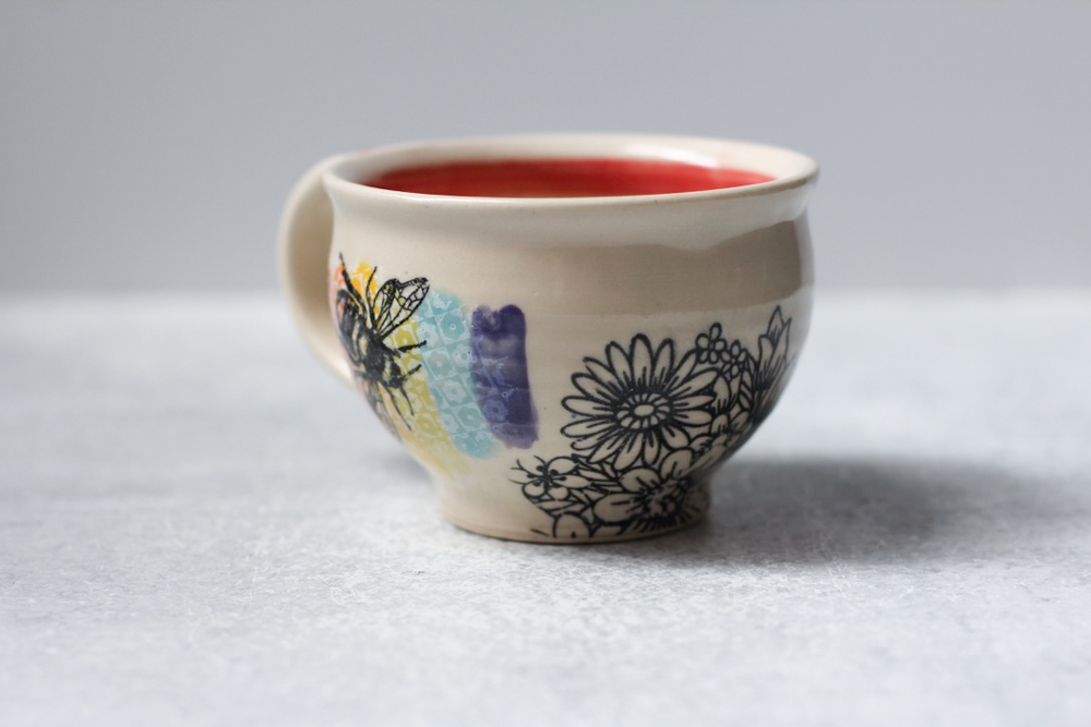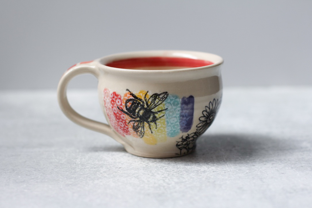 All pieces are made by hand in my Easthampton, Massachusetts studio. Each piece begins as white stoneware clay. First, the clay is thrown by hand on the potter’s wheel, forming the shape. For mugs and other items with handles, a coil of clay is joined to the side, and methodically pulled to form a smooth, comfortable handle. Following a bisque firing in the kiln, the piece is hand-decorated using a combination of hand-drawn underglaze transfer and slip-painting. Then the piece is hand-dipped in a clear glaze and fired once more in the kiln to make the finished product.