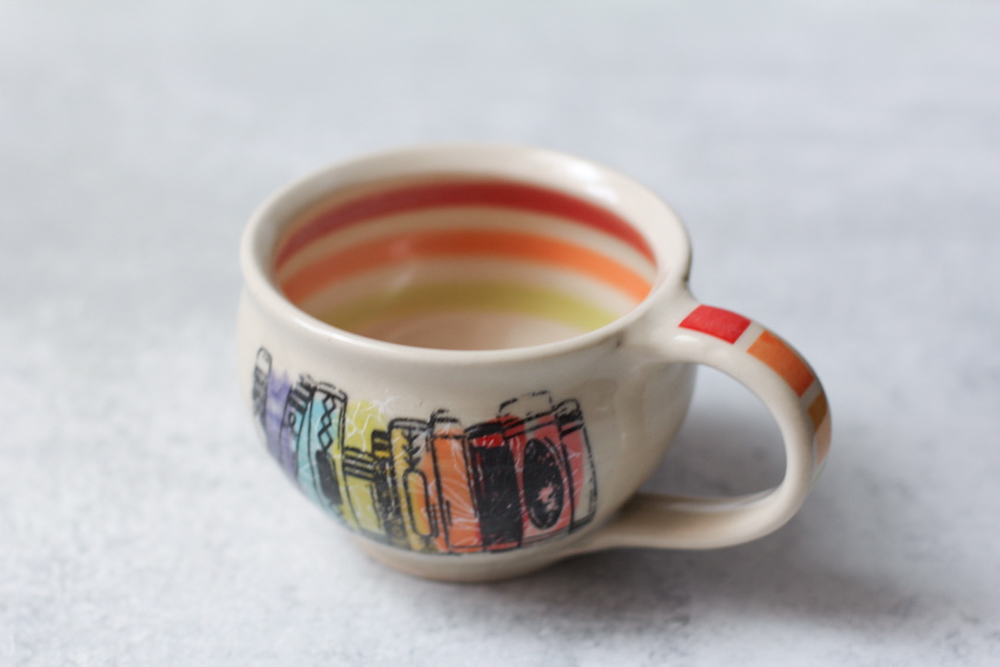 All pieces are made by hand in my Easthampton, Massachusetts studio. Each piece begins as white stoneware clay. First, the clay is thrown by hand on the potter’s wheel, forming the shape. For mugs and other items with handles, a coil of clay is joined to the side, and methodically pulled to form a smooth, comfortable handle. Following a bisque firing in the kiln, the piece is hand-decorated using a combination of hand-drawn underglaze transfer and slip-painting. Then the piece is hand-dipped in a clear glaze and fired once more in the kiln to make the finished product.