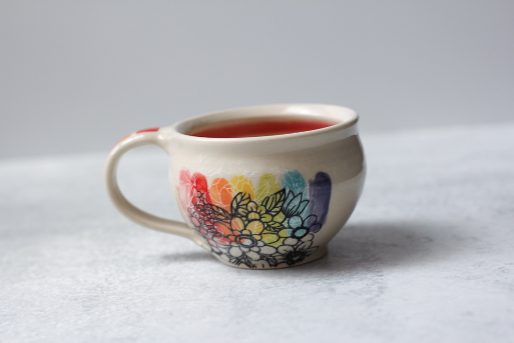 Wheel thrown and hand-decorated, my stoneware mugs are an everyday favorite. Made with great care and attention to detail, they are a comfortable weight, with a smooth handle. Sizes vary due to the handmade nature of my work. Holds approximately 9 ounces of liquid.
