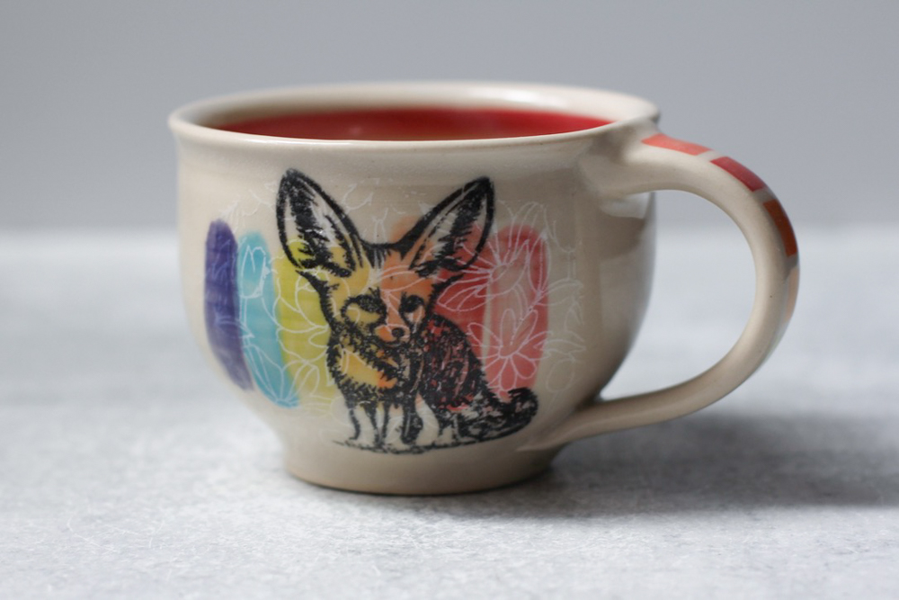All pieces are made by hand in my Easthampton, Massachusetts studio. Each piece begins as white stoneware clay. First, the clay is thrown by hand on the potter’s wheel, forming the shape. For mugs and other items with handles, a coil of clay is joined to the side, and methodically pulled to form a smooth, comfortable handle. Following a bisque firing in the kiln, the piece is hand-decorated using a combination of hand-drawn underglaze transfer and slip-painting. Then the piece is hand-dipped in a clear glaze and fired once more in the kiln to make the finished product.