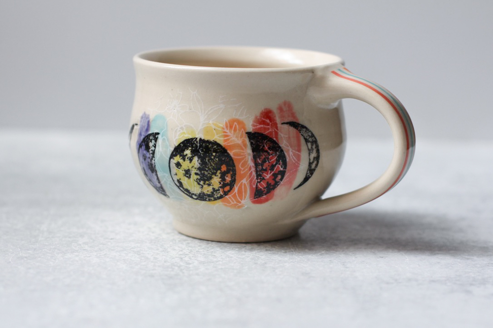 Wheel thrown and hand-decorated, my stoneware mugs are an everyday favorite. Made with great care and attention to detail, they are a comfortable weight, with a smooth handle. Sizes vary due to the handmade nature of my work. Holds approximately 9 ounces of liquid.