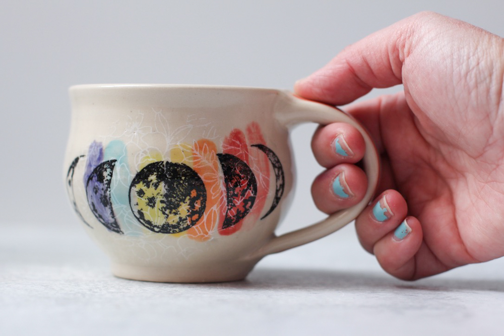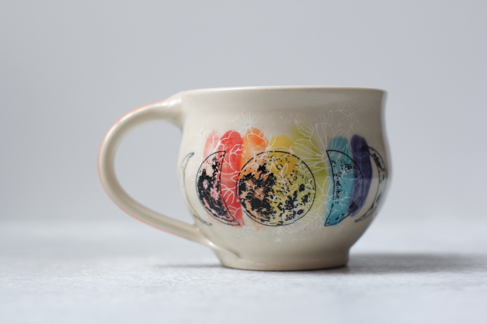 All pieces are made by hand in my Easthampton, Massachusetts studio. Each piece begins as white stoneware clay. First, the clay is thrown by hand on the potter’s wheel, forming the shape. For mugs and other items with handles, a coil of clay is joined to the side, and methodically pulled to form a smooth, comfortable handle. Following a bisque firing in the kiln, the piece is hand-decorated using a combination of hand-drawn underglaze transfer and slip-painting. Then the piece is hand-dipped in a clear glaze and fired once more in the kiln to make the finished product.