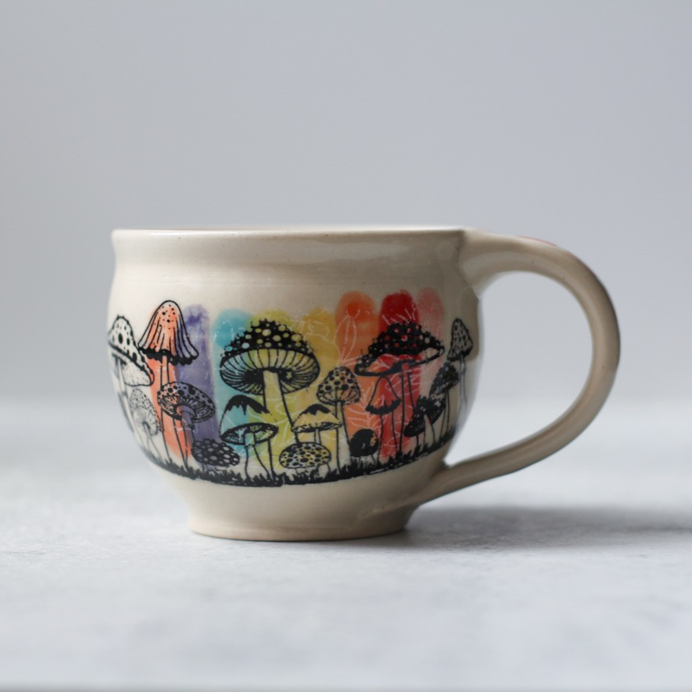 All pieces are made by hand in my Easthampton, Massachusetts studio. Each piece begins as white stoneware clay. First, the clay is thrown by hand on the potter’s wheel, forming the shape. For mugs and other items with handles, a coil of clay is joined to the side, and methodically pulled to form a smooth, comfortable handle. Following a bisque firing in the kiln, the piece is hand-decorated using a combination of hand-drawn underglaze transfer and slip-painting. Then the piece is hand-dipped in a clear glaze and fired once more in the kiln to make the finished product.