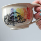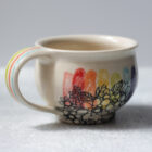 All pieces are made by hand in my Easthampton, Massachusetts studio. Each piece begins as white stoneware clay. First, the clay is thrown by hand on the potter’s wheel, forming the shape. For mugs and other items with handles, a coil of clay is joined to the side, and methodically pulled to form a smooth, comfortable handle. Following a bisque firing in the kiln, the piece is hand-decorated using a combination of hand-drawn underglaze transfer and slip-painting. Then the piece is hand-dipped in a clear glaze and fired once more in the kiln to make the finished product.